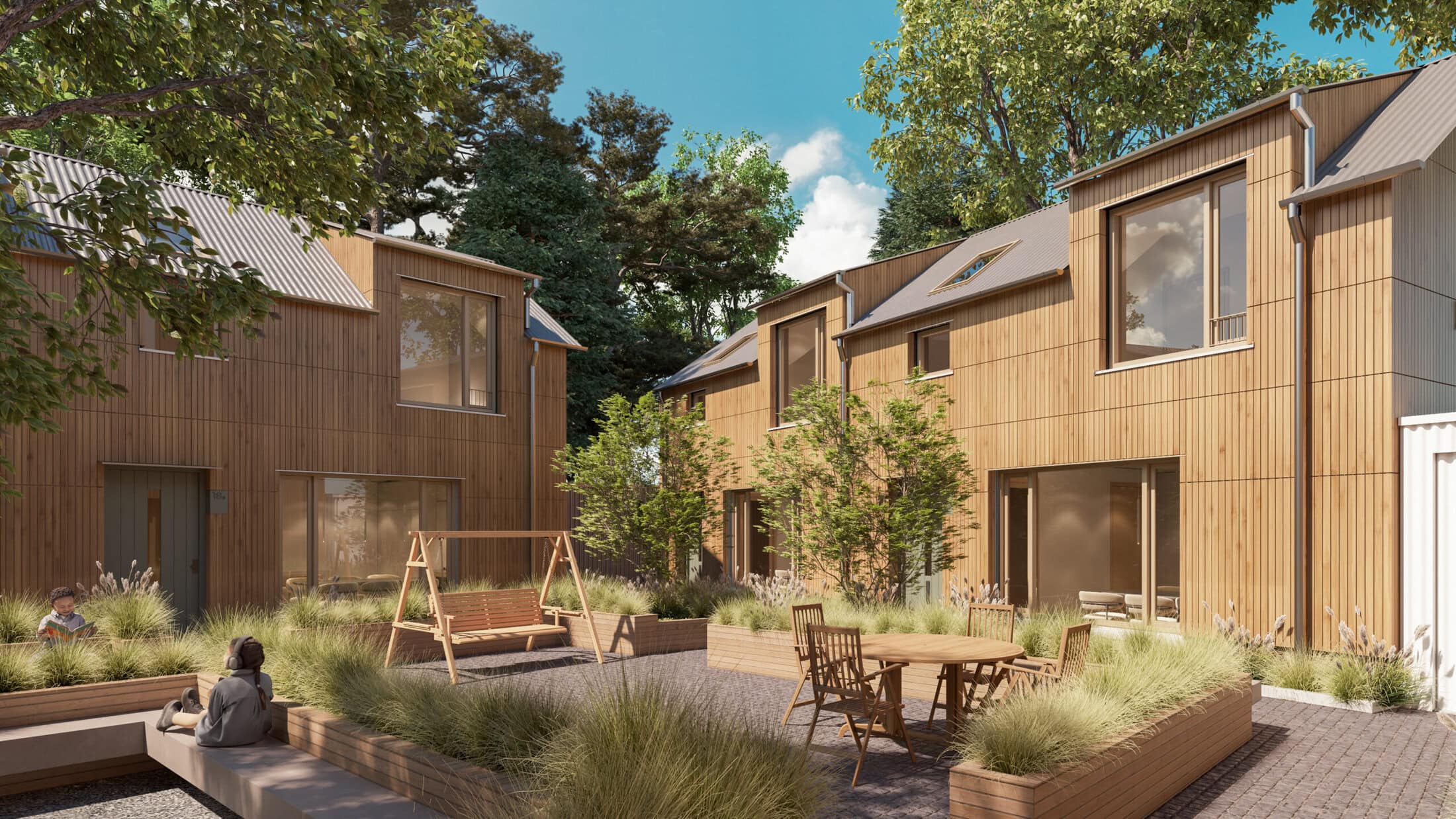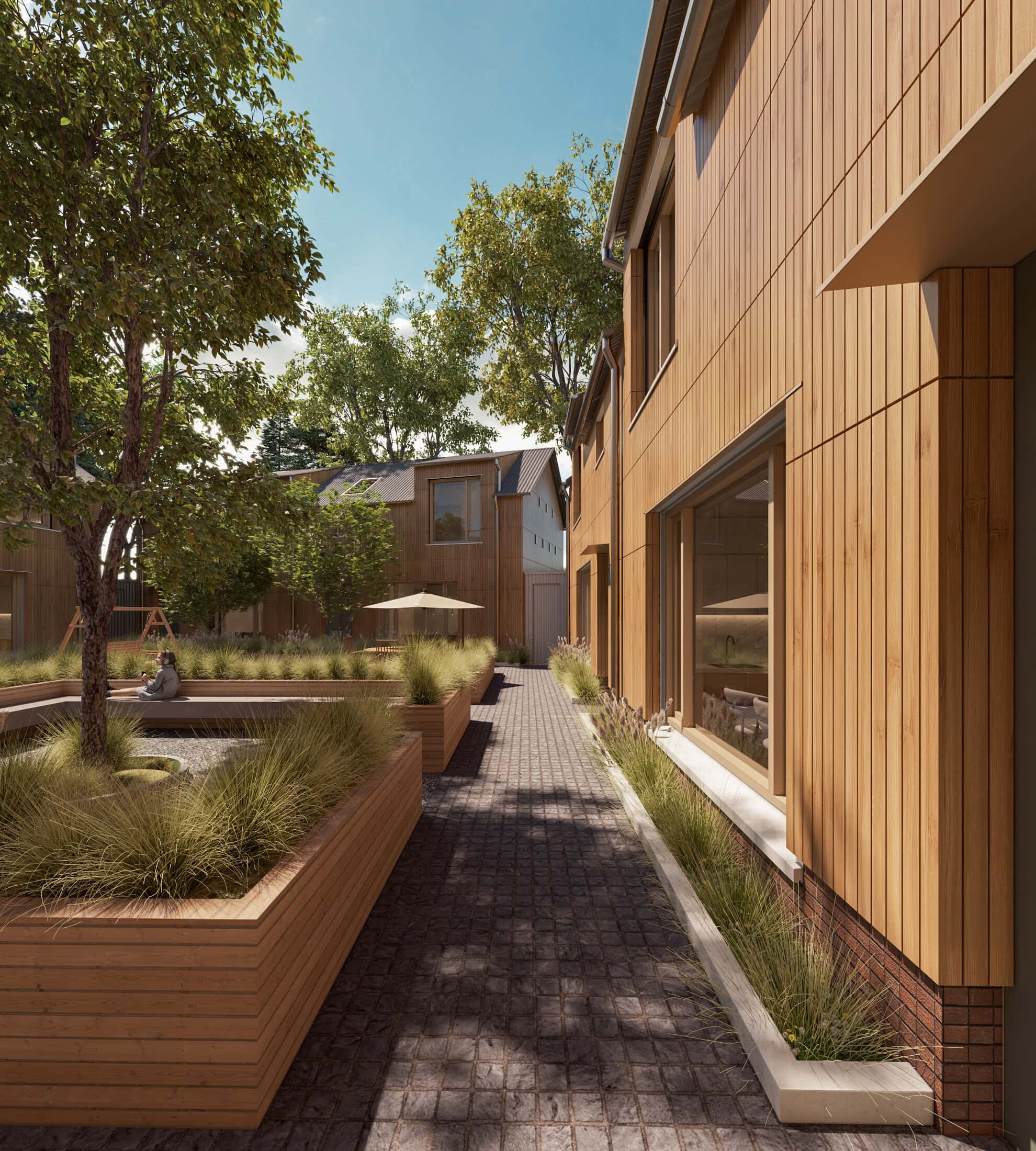 Op deze historische plek ontwikkelen we een intiem hofje met negen biobased woningen rond een gedeelde binnentuin. Het concept past historisch goed naast de kerk en biedt negen kleine tweelaagse woningen in diverse varianten. Het zorgvuldige ontwerp van VLOT architecten maakt de Melkweg tot een groen en stil laantje.
